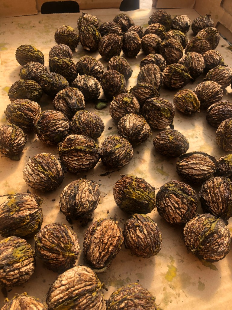 You can see how after not very much time, the outer bits, which are almost spongy, turn darker with time. I have gifted a few boxes of the husks (husks? outer bits?) away to friends who enjoy using them as a dye for clothing. Pretty cool!